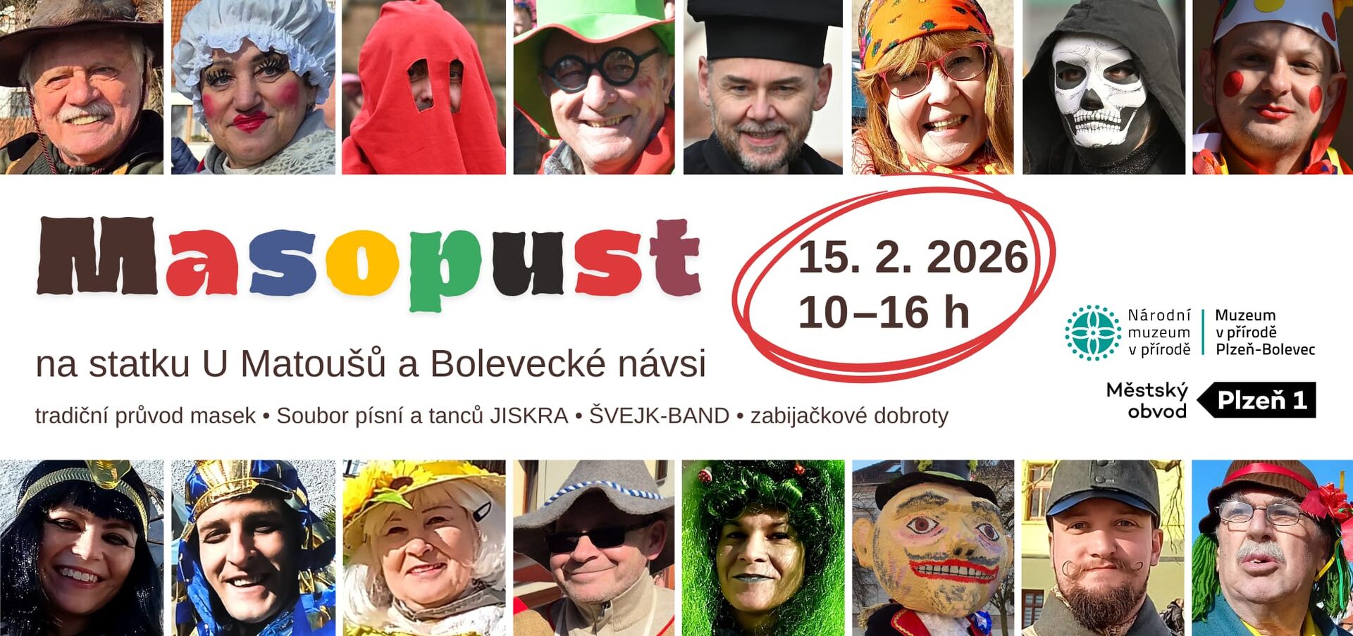 Průvod bude doprovázet lidový Soubor písní a tanců JISKRA, návštěvníci se mohou těšit i na děti z Jiskřičky a folklórní soubor JISKRA 58. Živo bude i na statku, kde zahraje ŠVEJK-BAND, a protože k masopustu patří zabijačkové dobroty, chybět nebude ani komentovaná ukázka porcování prasete.