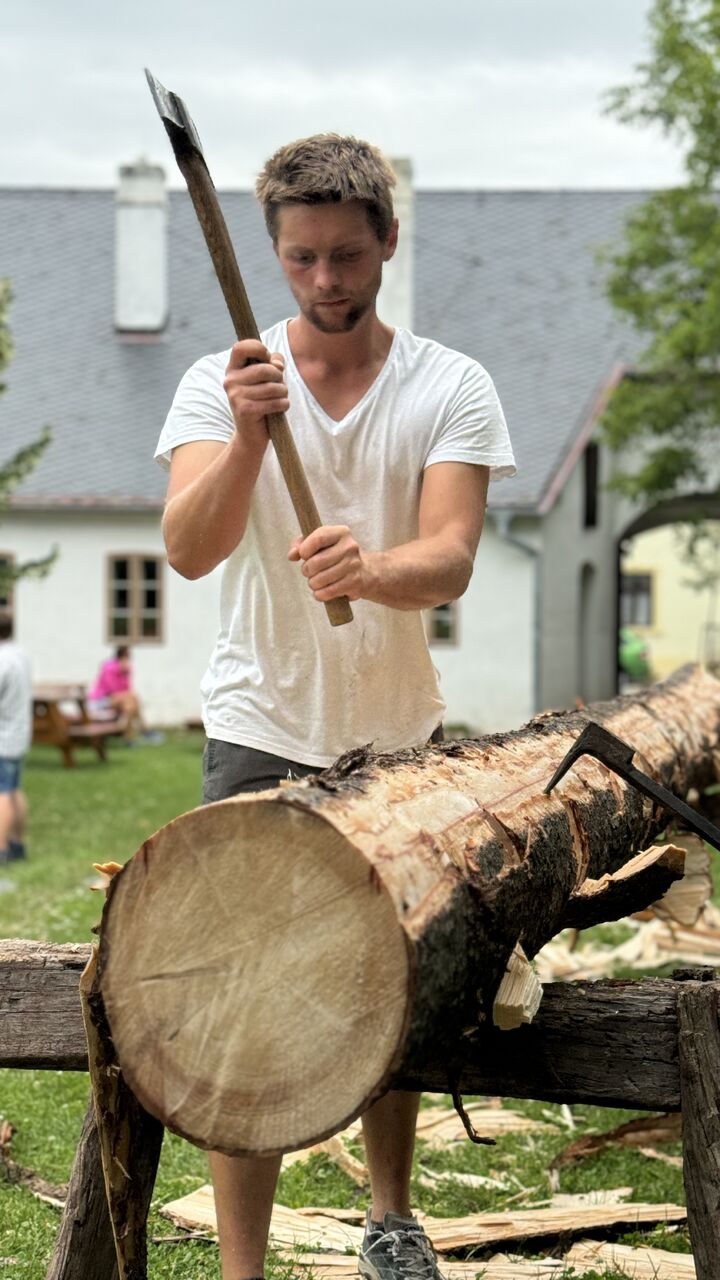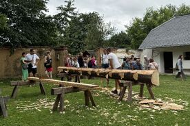 - ukázky hoblování, otesávání a dalšího zpracování dřeva za použití tesařských nástrojů a nářadí