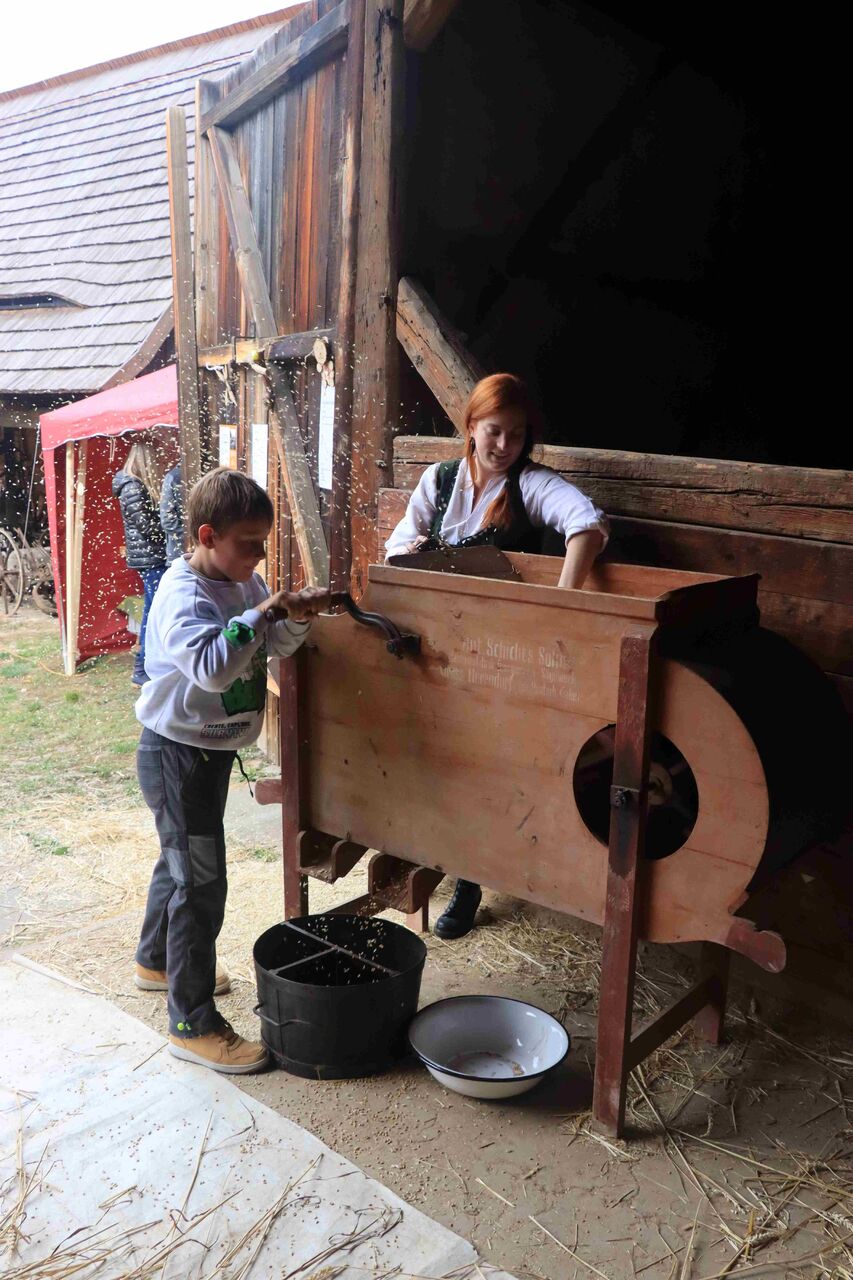 Po oba dva dny se v muzeu věnujeme ukázkám vybraných zemědělských činností. Ve stodole si mohou návštěvníci vyzkoušet roztočit cep a vymlátit obilí na mlatu. Následně zrno vyčistí na fukaru a zjistí, co to dělá, když se točí žentourem. Zájemci mohou poznat, jak se pracovalo se lnem na mědlici nebo na vochlici, aby získali vlákno, z kterého se stáčí nitě na kolovratu. Zjistit můžete, že pracovat s provaznickými vozíčky při výrobě provazu nebylo zcela snadné. V síni probíhá ukázka stloukání másla a ve světnici pečou hospodyně koláče v kachlovém sporáku. V sušárně ovoce zavoní čerstvě usušené křížaly. Ve stodole ze Zadní Lhoty probíhá výstava tradičních odrůd ovoce zejména z oblasti Českého středohoří a k ochutnání bude čerstvě vylisovaný mošt. Ve mlýně Týniště čp. 27 probíhá mletí mouky na kamenném ručním mlýnku. Vyučování ve škole s výukou krasopisu a dětské hry představí děti z folklórního souboru Křiničánek. Sedlání koníků a jejich přípravu do tahu živě předvede stáj Toulavý kůň z Mukařova i s ukázkou orby na poli Odvážnější si mohou vyzkoušet, jak vypadá svět z koňského hřbetu. Pro malé i velké je připravena stezka plná her a úkolů. Dvory usedlostí i zubrnická náves ožijí prodejními stánky a ukázkou zemědělské techniky,“ zve na pestrý program do muzea Ivana Mikulecká, ředitelka Muzea v přírodě Zubrnice.