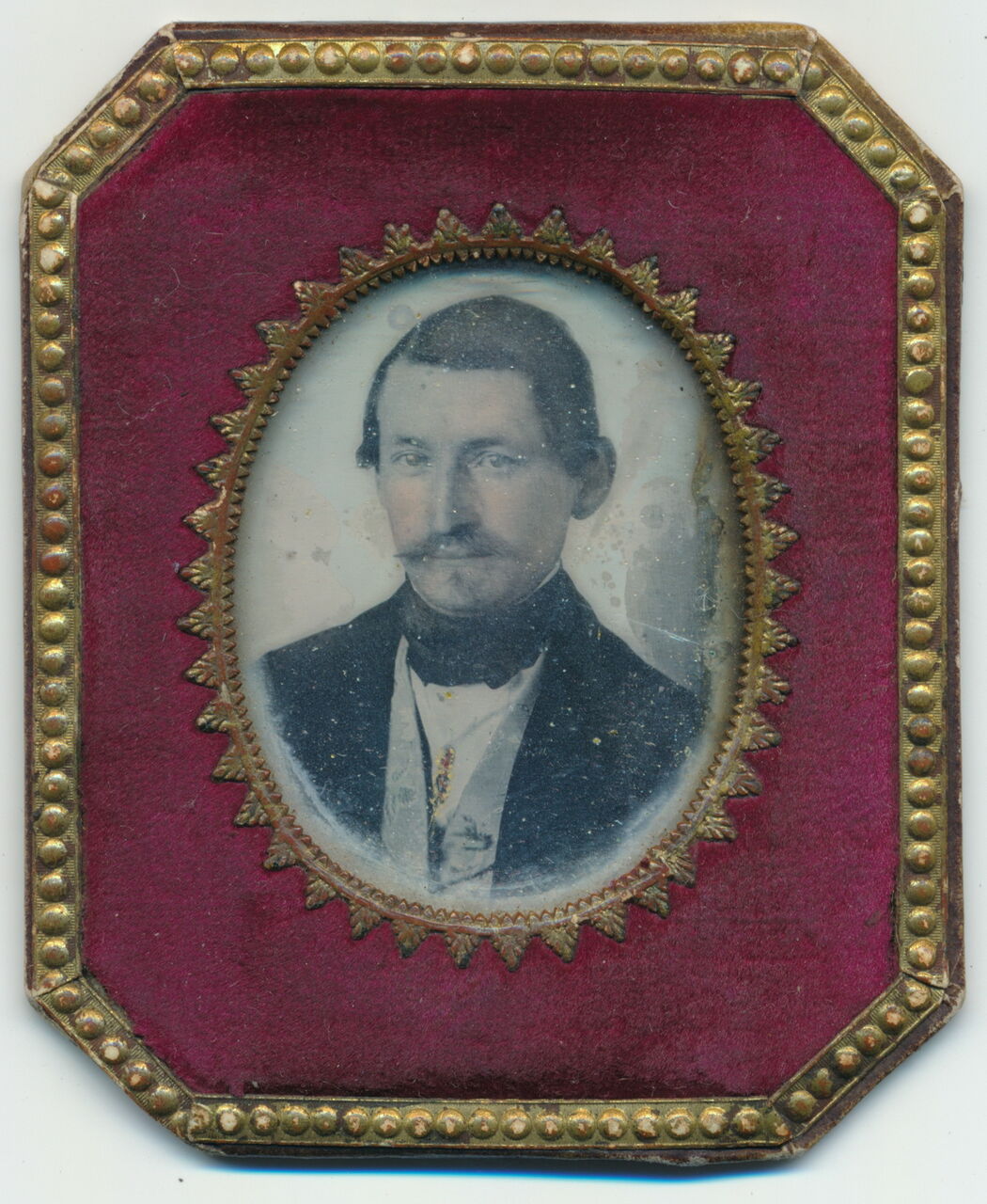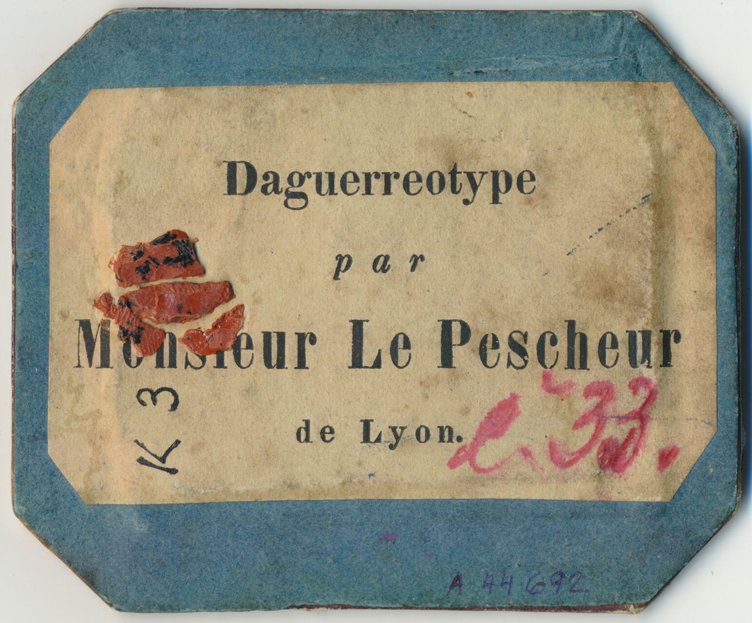 Jedná se o černobílý, ručně kolorovaný portrét neznámého muže. Formát daguerrotypie tvoří obdélník (7 x 6 cm) se zkosenými rohy, potažený červeným sametem, po okrajích cizelovaný mosazným kováním zdobeným tzv. bombírováním. Uprostřed je v sametu oválný výřez s portrétem, okraj oválu je lemovaný mosazným kováním se stylizovanými lístky. Na zadní straně najdeme informace o ateliéru – Monsieur Le Pescheur de Lyon. Podařilo se nám studijně dohledat další portréty tohoto autora či ateliéru – na první pohled jsou identifikovatelné podle charakteristickému „rámečku“ s červeným sametem a kováním. Možná na ně také narazíte při svých toulkách online světem.