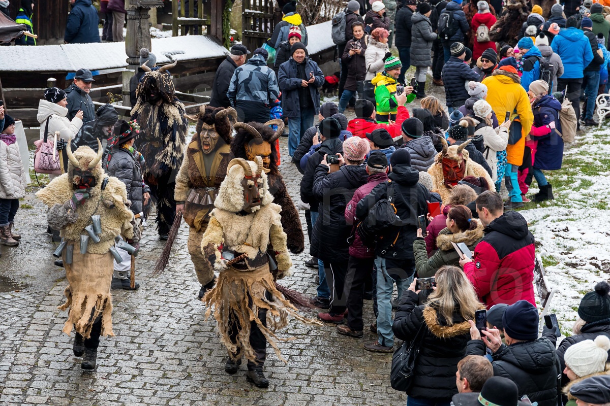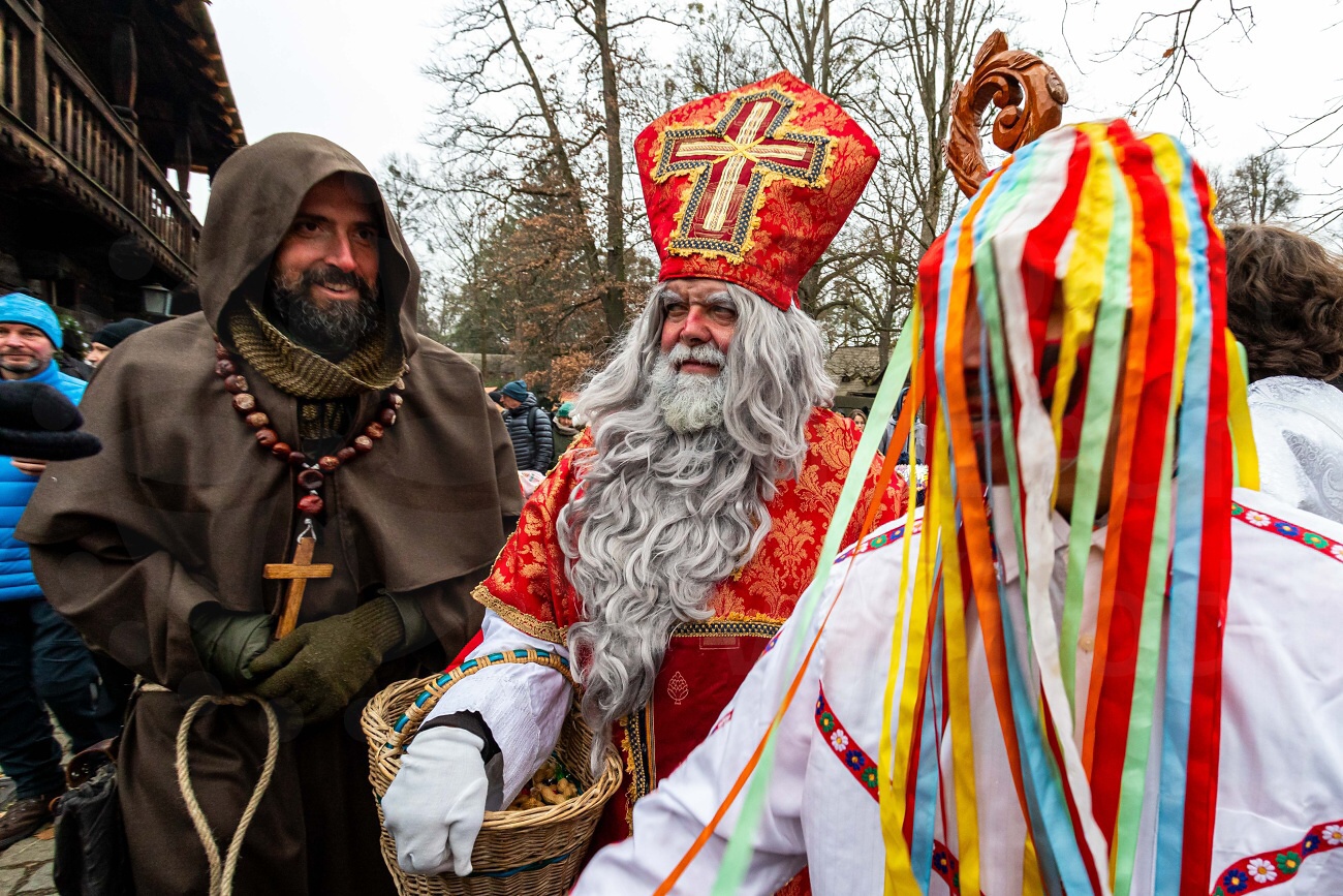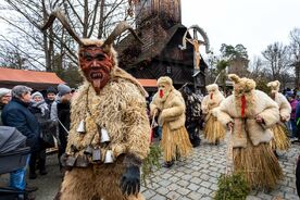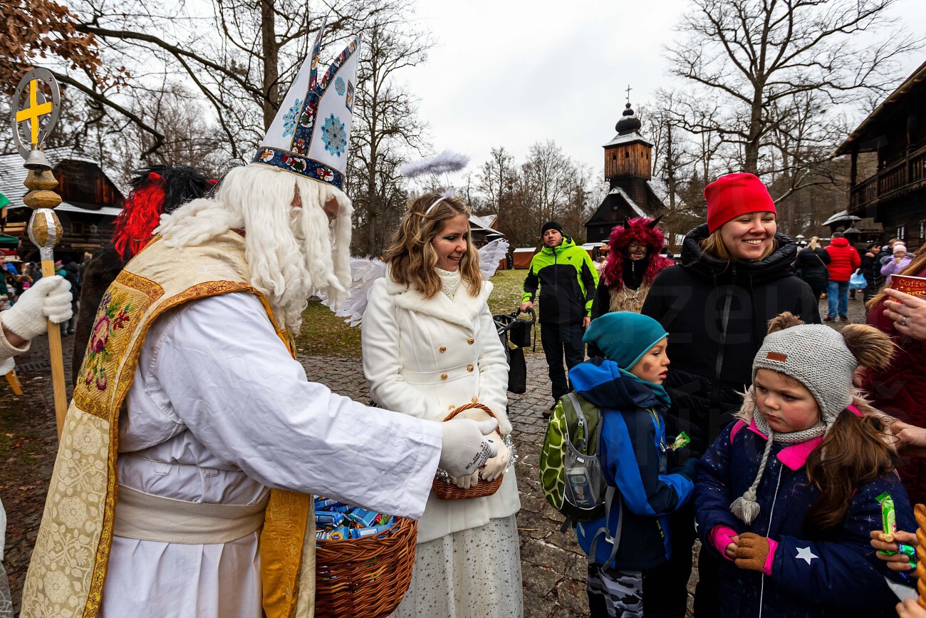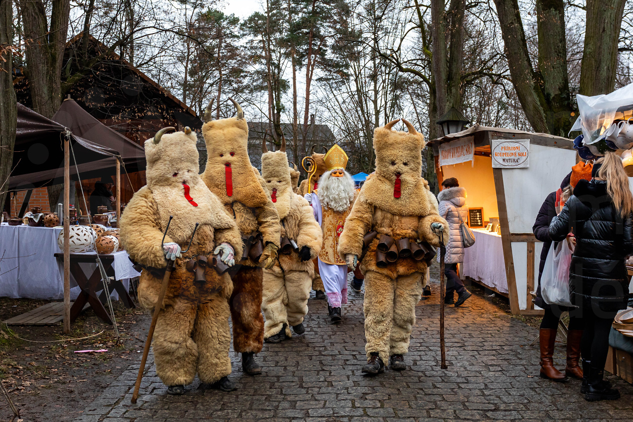 Nabídka dárků z dílen lidových výrobců, koledování, obchůzky lucek a čertů, oživené expozice ve Valašské dědině.