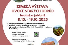 V sobotu 11. 10. 2025 v 10:00 hod. rovněž proběhne vernisáž  Zemské výstavy ovoce starých odrůd.  Tato výstava, ve stodole ze Zadní Lhoty (součást prohlídkového okruhu Muzea), potrvá do 19. 10. 2025.