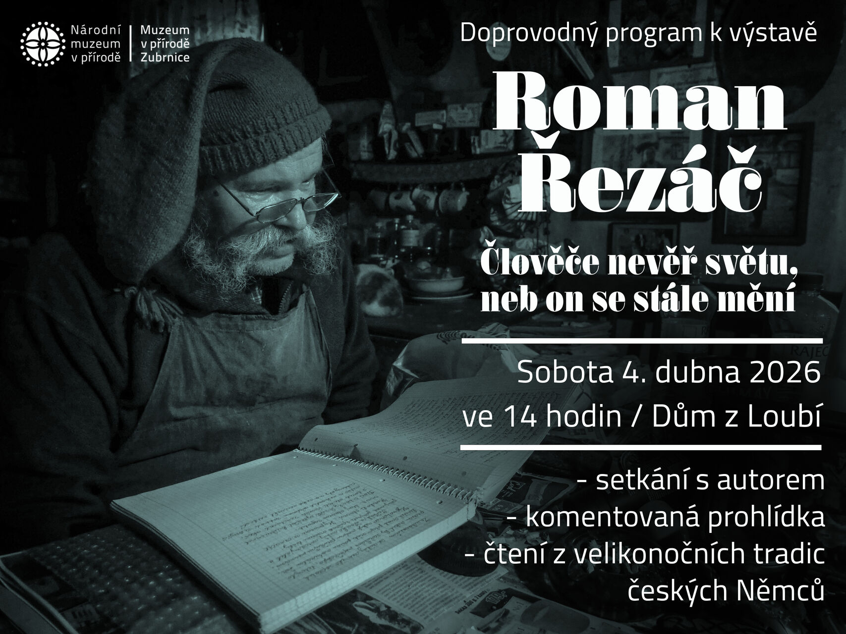 v sobotu 4.4.26 od 14:00 hod. komentovaná prohlídka výstavy Člověče, nevěř světu, neb on se stále mění samotným autorem Romanem Řezáčem, jejíž součástí bude i velikonoční čtení