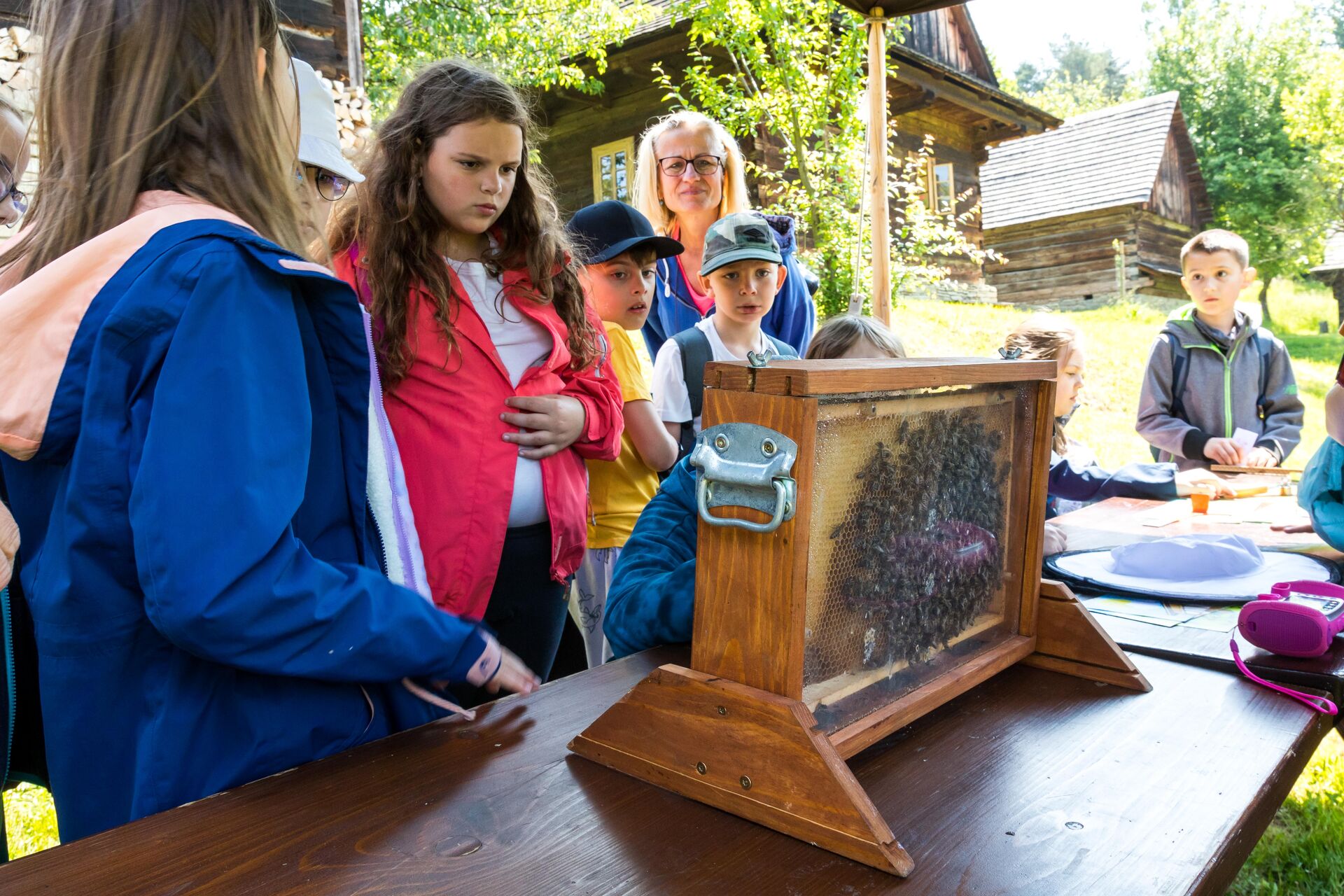 Ve Valašské dědině se projdete kolem klátových úlů vyrobených z kmenů stromů, potkáte se s včelaři a možná budete moci pozorovat i živé včely ve skleněném úlu. Ve školní expozici se zúčastníte vyučování o životě včelího společenství a prohlédnete si včely i pod mikroskopem. Závěr programu vám osladí medová ochutnávka a v praktické dílně si vyzkoušíte práci dřívějších voskařů nebo perníkářů.