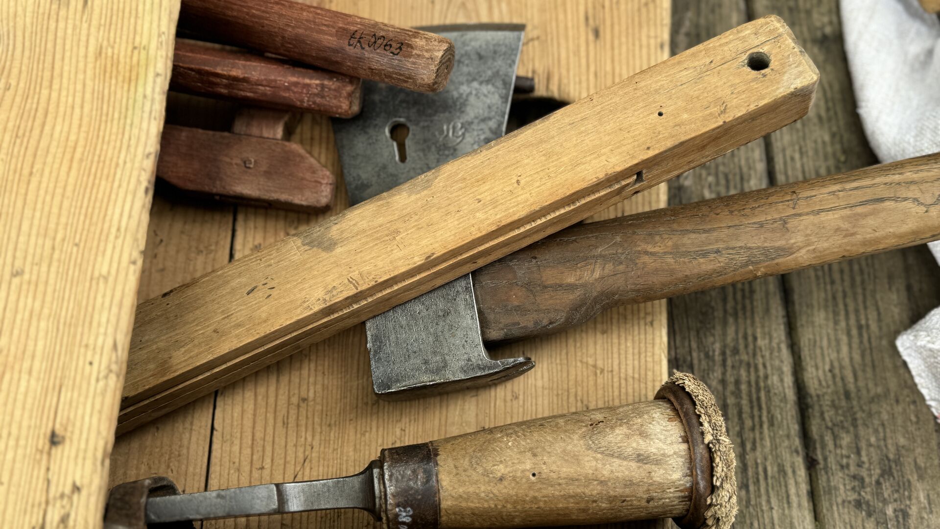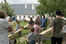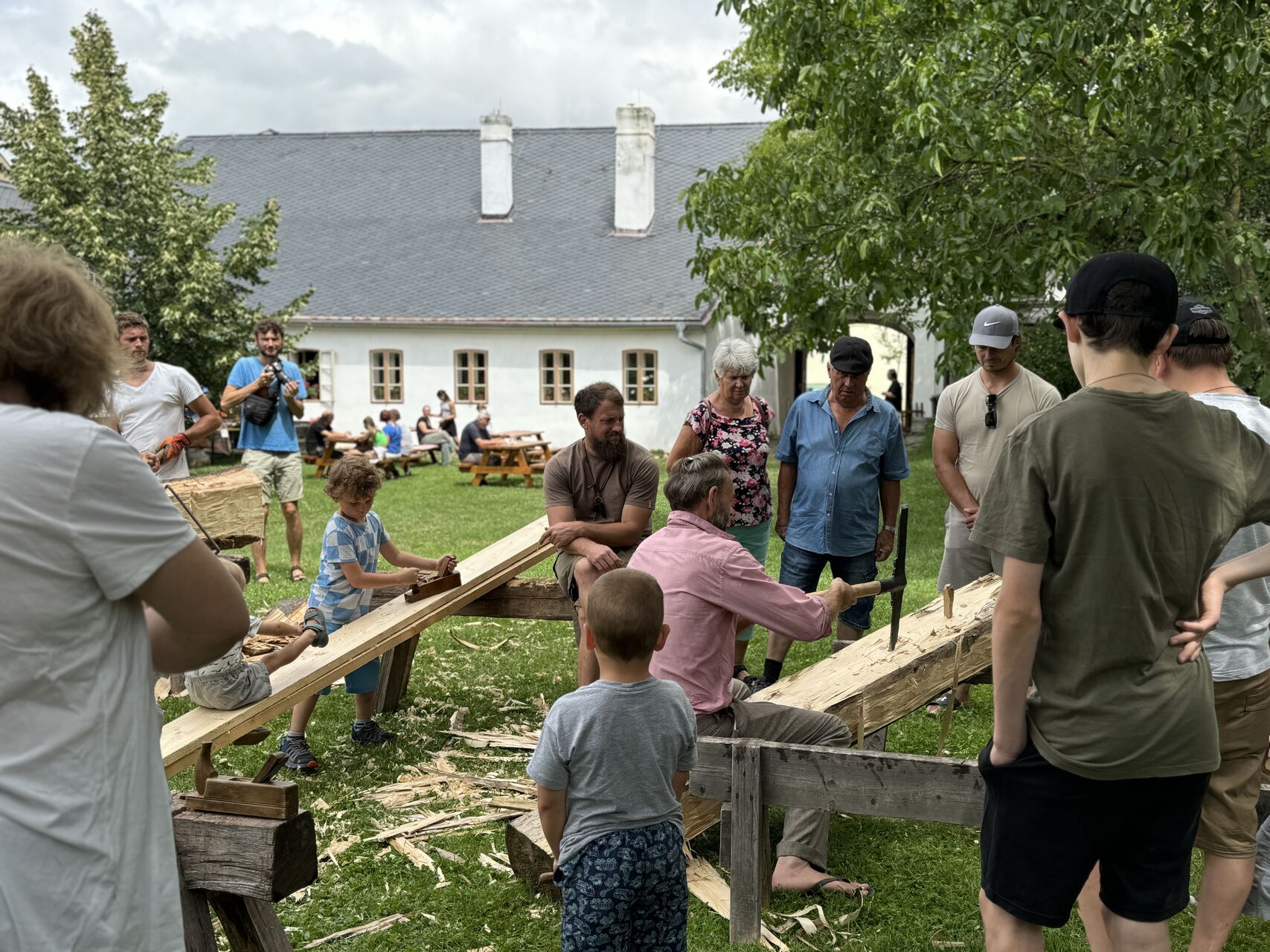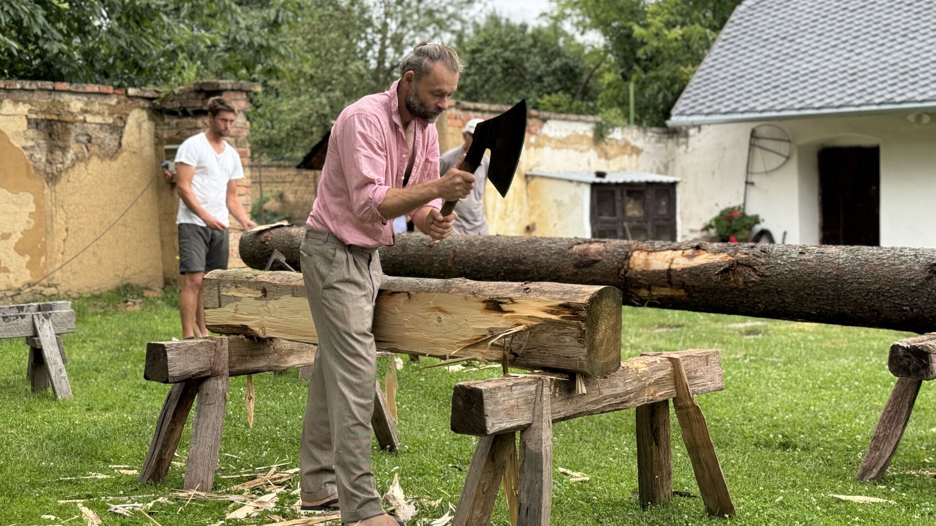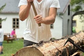 - ukázky hoblování, otesávání a dalšího zpracování dřeva za použití tesařských nástrojů a nářadí