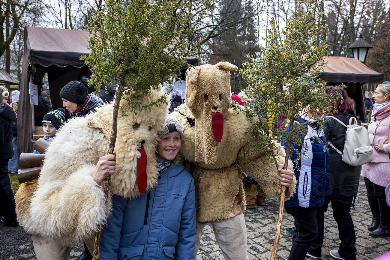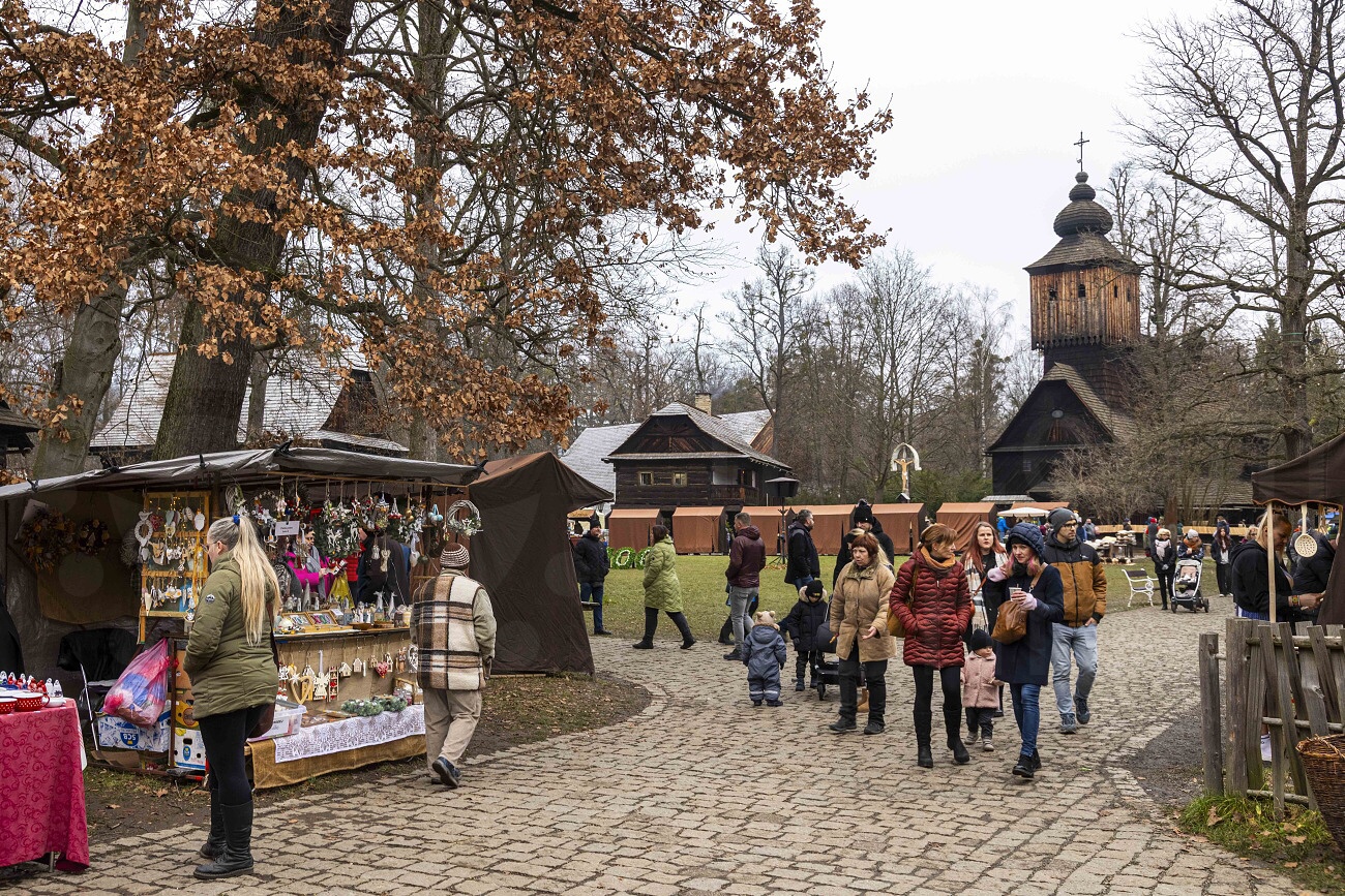 Nabídka dárků z dílen lidových výrobců, koledování, obchůzky lucek a čertů, oživené expozice ve Valašské dědině.