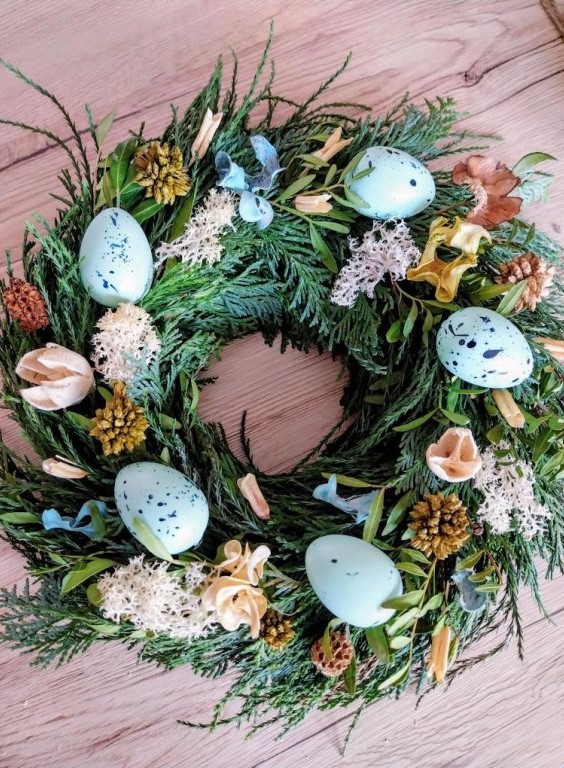 Používat budeme pouze přírodní materiál - jarní zeleň, sušiny, doplňkovou zeleň s plody, borůvčí a drobné jarní/velikonoční ozdoby.
