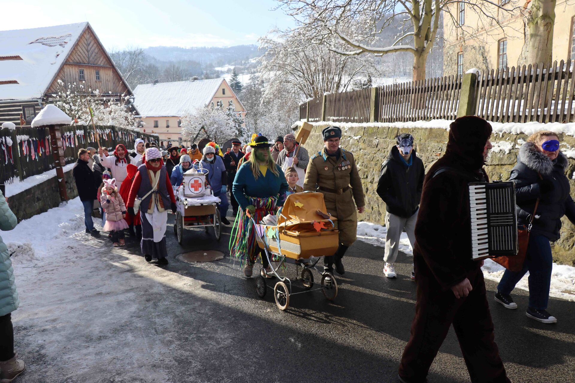 „Tradiční masopustní obchůzku na Veselém Kopci předvedou obyvatelé ze Studnice. V 10.00 hodin bude před statkem z Mokré Lhoty slavnostně uděleno povolení k obchůzce, tento obřad bude zopakován ještě jednou ve 13.00 hodin, následně průvod masek vykročí mezi jednotlivé roubené objekty. U každé roubenky masky zatancují obřadní kolečko. Zblízka uvidíte všechny tradiční masky: strakatého, ženu, turky, slaměné, rasa s kobylou, kominíky i kramáře. Během obchůzky se však musíte připravit i na jejich žerty, ke kterým od pradávna patří např. pomazání obličeje zvláštním mazadlem. V 15.00 hodin se masky shromáždí k závěrečnému obřadu, přednesou masopustní testament, v němž budou vzpomenuty hříchy, jichž se dopustila maska kobyly. Maska kobyly pak bude obřadně poražena a masopustní obchůzku ukončí veselý tanec všech masek. Po celý den můžete nahlédnout do zpřístupněných objektů, které budou otevřeny od 9.30 do 16.00 hodin, nebo si zakoupit upomínkové předměty, včetně figurek masopustních masek, a tiskoviny. V polygonální stodole bude v tento den připravena ke zhlédnutí výstava Masopustní obchůzky na Hlinecku, při které se můžete o tomto obyčeji dozvědět další zajímavé informace. V Hospodě Na Vejměnku se bude v tento den konat staročeská zabijačka, návštěvníci si díky tomu budou moci zakoupit také jitrnice a ovar,“ pozvala na Veselý Kopec Magda Křivanová, ředitelka Muzea v přírodě Vysočina.