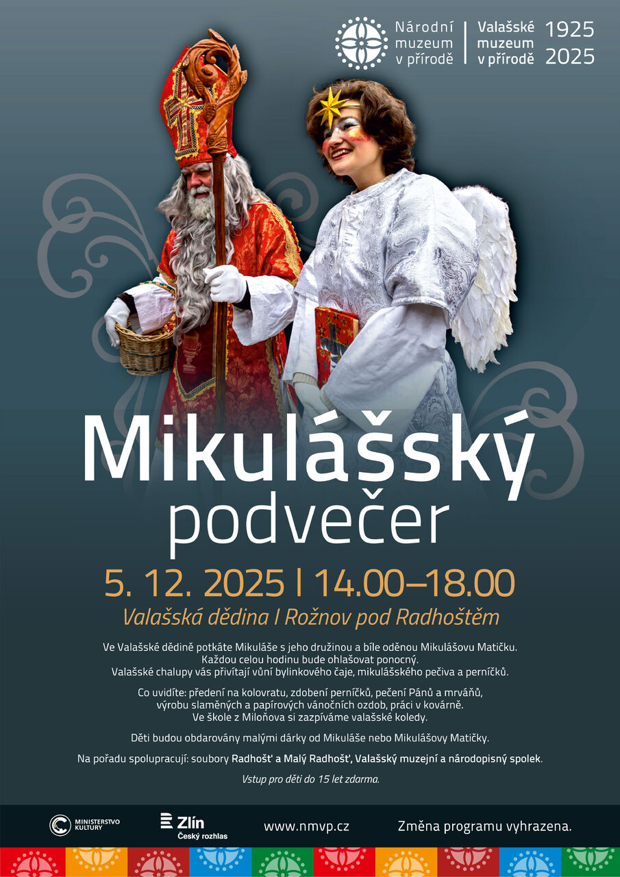 Rožnovské Valašské muzeum v přírodě připravuje na pátek 5. 12. prohlídku areálu Valašská dědina spojenou s mikulášskou nadílkou. Mikulášský podvečer začíná ve 14.00 „Následovat pak bude Vánoční jarmark (13.- 14. 12.), Živý betlém (20. a 21. 12.) a 26.12. pak Štěpánská koleda. Do celé škály vánočních pořadů Valašského muzea v přírodě ještě musíme doplnit rorátní mši svatou v kostele sv. Anny v Dřevěném městečku (sobota 6. 12., 7.00) a slavnostní předvánoční koncert Večer při svíčkách (6. 12., od 17.00), které navodí pocit klidu a předvánočního rozjímání,“ doplnil výčet adventních a vánočních pořadů v jednotlivých muzeích Národního muzea v přírodě generální ředitel a ředitel Valašského muzea v přírodě Jindřich Ondruš.
