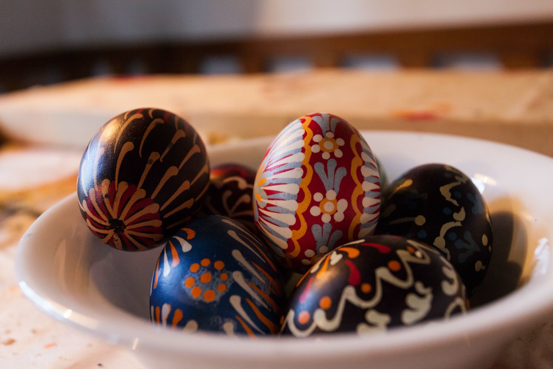 Zdobení vajec voskovou batikou a malováním barevnými vosky.