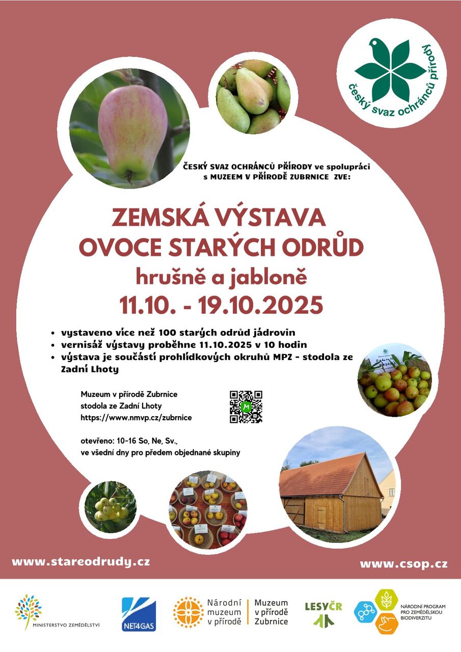 V sobotu 11. 10. 2025 v 10:00 hod. rovněž proběhne vernisáž  Zemské výstavy ovoce starých odrůd.  Tato výstava, ve stodole ze Zadní Lhoty (součást prohlídkového okruhu Muzea), potrvá do 19. 10. 2025.